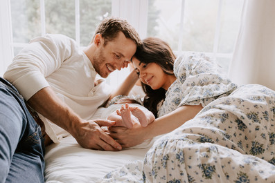 At my sessions I love for you and your spouse to be relaxed, put on some of your favorite music, pour a cup of coffee and really just soak in your time admiring your new little bundle of joy while I capture those early days. We can take breaks as needed for feeding the baby as well and don't worry about all of the extra baby items in the living room, we can move things around as needed at your session to create beautiful photos of you with your little one.